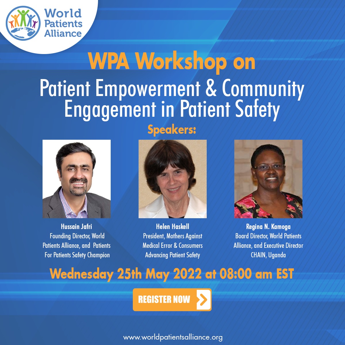 The WPA online workshop, Patient Empowerment and Community Engagement in Patient Safety, took place on May 25, 2022. Speakers were WPA president Hussain Jafri, WPA Board member Regina Namata Kamoga, and WPA Patient Safety Committee member Helen Haskell. The speakers reprised issues they had introduced at the Saudi Patient Safety Conference in Jeddah in 2019.