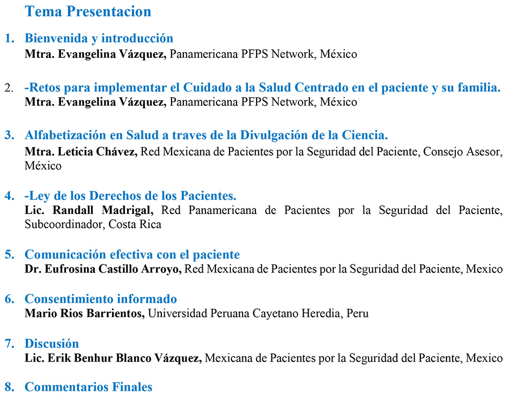 El cuidado a la salud centrado en el paciente y su familia es un tema novedoso y coherente a la realidad actual y coincide con la madurez de los movimientos de pacientes en la actualidad. Actualmente en muchos sistemas de salud se ha logrado el primer paso para implementarlo, pero se han encontrado diversos desafíos para establecer este tipo de cuidado de forma óptima. Es primordial empoderar al paciente para poder implementar este tipo de cuidado. Recordando que, el empoderamiento del paciente requiere de 3 aspectos: alfabetización en salud, desarrollo de habilidades de los pacientes, sobre todo de comunicación, liderazgo, etc. y por último, pero no menos importante, la creación de un ambiente sanitario resiliente y abierto a la participación de los pacientes. La Mtra. En Ciencias Evangelina Vázquez retoma estos puntos para introducir y visibilizar estos puntos en la primera conferencia de este seminario. A continuación, la Mtra. Leticia Chávez, divulgadora de la ciencia aborda de forma novedosa la opción de utilizar la divulgación de la ciencia como herramienta para la alfabetización en salud, lo que le da a este aspecto, un matiz apolítico y convierte la alfabetización en salud como información básica para todas las personas. La Mtra. mostró ejemplos de esa labor que ha realizado la Universidad Nacional Autónoma de México con la Red Mexicana de Pacientes por la Seguridad del Paciente. El apoyo de instituciones educativas para esa labor genera un cambio positivo en términos generales. Pero también se debe tener bases legales para establecer el cuidado a la salud centrado en el paciente y para ello se debe contar de forma legal, con una ley de pacientes que confirme los derechos de los mismos. El abogado Randall Madrigal, en la conferencia sobre Ley de los derechos de los pacientes, aborda detalles de dicha labor, y los avances en Latinoamérica al respecto. A continuación, habló la Dra. Eufrosina Castillo, sobre la Comunicación efectiva, enfocándose en la comunicación entre pacientes, familias y profesionales de salud para finalmente apoyar en el empoderamiento del paciente. Abordó detalles específicos sobre la Acción esencial denominada Comunicación efectiva y aspectos que se deben conocer de ella. Para finalizar, El abogado Mario Ríos aborda un aspecto dentro de los derechos de los pacientes, el consentimiento informado como herramienta legar de apoyo dentro de los derechos de los pacientes, que, aunque existe en la mayoría de países, no se ha usado de forma óptima para empoderar al paciente. Al final en moderador Lic. Erik Blanco compartió preguntas que contestaron los ponentes, lo cual generó una discusión enriquecedora.